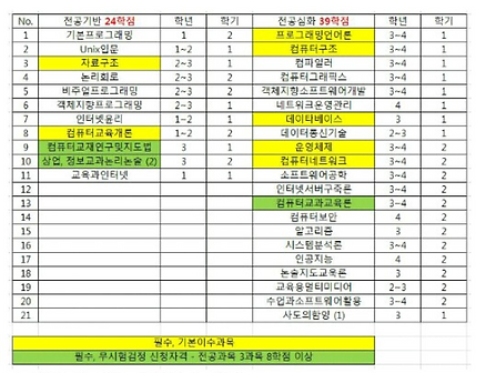 다음은 전공 영역에서 졸업을 위해 들어야 하는 총 학점과 컴퓨터 교육과 필수 전공 과목을 정리한 것이다.